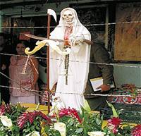 “Thou Shalt Not Steal” probably wouldn’t go over well with that crowd, but the Fathers are continually sermonizing against Santa Muerte, the Afro-Brazilian(?)-Cuban(?)-Mexican voodoo protector of those with dangerous occupations (… like, cops, robbers and prostitutes). While the ecumenical council of icon vendors just outside the church gates sell both, they defer to tradition and stick Santa Muerte under the counter on San Judeo Day.Día de los Muertos is November 2 – She’ll be back…. Whhhhoooooooo!