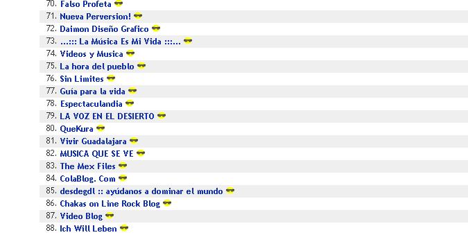 BUT, this this is kinda cool. I thought I might hit 1000 posts a day this week. I didn’t but we’re getting pretty close … wordpress records the stats from 7 PM to 7 PM my time (Central US and Mexico — which is midnite to midnite GMT). Wednesday to Thursday, there were 991 hits. Normally, the hits drop over the weekend, but lento y lento the Mex Files overall numbers keep growing. I never thought my odd-ball English-language blog would be listed as one of the top 100 Mexican blogs by (Peruvian based) Blogalaxia — numero 83 and climbing.