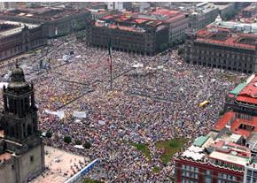 CIUDAD DE MEXICO — El candidato izquierdista que perdió por escaso margen las elecciones presidenciales emitió un mensaje de desafío al gobierno ante cientos de miles de seguidores en la plaza principal de México, a fin de reactivar su decaído gobierno de resistencia, un movimiento que amenaza con dividir a la izquierda.