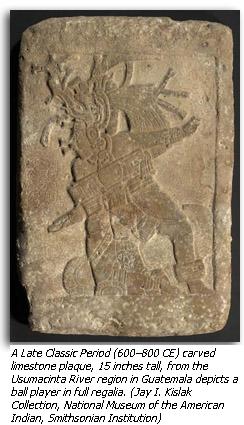 The fanciful tales were enacted on the ball courts of life, with the story of the life cycle of maize and the resurrection of the Maize God, who is identical to Hun Hunahpu, at the center of the ritual. The game as played by the Mayans employed hands only to put the ball in play. Otherwise, players propelled the rubber ball off surrounding walls using upper arms, hips and thighs, attempting to send the ball through elevated stone rings. Hips and knees were padded. Surviving artifacts show players wearing headdresses and long hipcloths. “[T]he balls themselves,” Miller writes, “were dangerous: heavy and sometimes moving at great speed, such a ball could break a bone, if not a neck, or damage internal organs” (81). At one point in the final encounter between the twins and the Xibalban lords, Xbalanque receives the ball, “the ball was stopped by his [waist] yoke, then he hit it hard and it took off, the ball passed straight out of the court, bouncing just once, just twice, and stopping among the ball bags.”