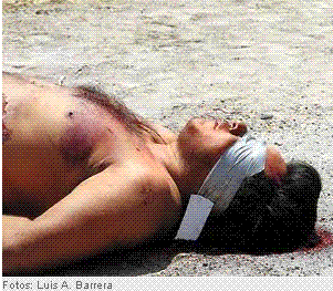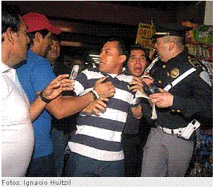 This photo, from la Prensa, accompanied a story on a couple of foot patrolmen who arrested two “ratas” (the word used by la Prensa) who’d been robbing — and beating up — women vendors in the Centro Historico. Score one for the solidarity of the mercantile class… the patrolmen did their best to keep the two from being too bruised and battered before turning them over to the Ministerio Publico.