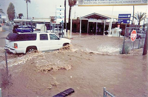 Yup, that’s right… the brilliant minds who poo-pooed environmental restrictions along the border seem to have forgotten that fences stop not people … but water. It does rain occasionally in desert, and the chain-link fence at Organ Pipe National Park clogged up with debris and … well, you can see the result.