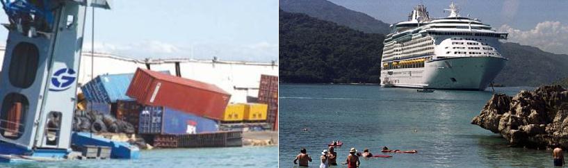 The photo on the left, from Lloyds, is of the port damage in Port-au-Prince as it was on 15-January. On the right is the PRIVATE port, where Carnival Cruise Line docked Friday. My living — like that of a couple hundred Haitians working for Carnival Cruise — depends on tourism for the most part, but some days its very hard not to have fantasies of DE-porting them all.