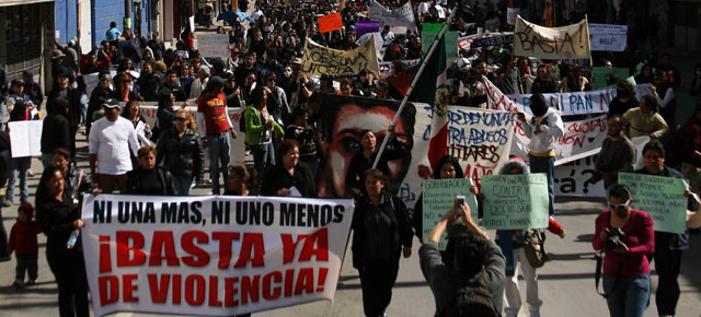 Led by Luz Maria Davíla (holding the large banner on the right), citizens of Juarez took to the streets to demand the army be retired from the streets, as well as the resignations of the city’s mayor, the state governor and Felipe Calderón. (Photo by Rubén García, Jornada)