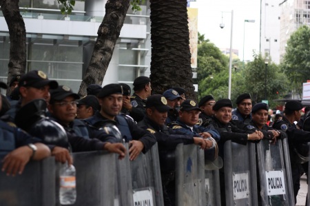 Lesley Téllez (The Mija Chronicles) was out with her camera on the streets of Mexico City after THE game. Whether this contingent was part of the force sent to clear the estimated 30,000 revelers out from around the Angel of Independence last night I can’t say, but when Ms. Téllez took the photo, it was a rare sighting indeed… granaderos (a Mexican term meaning “Imperial Storm Troopers”) ALMOST smiling.