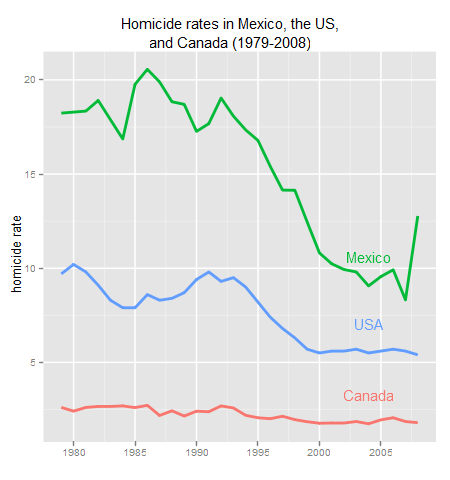 Notice which direction the always high Mexican homicide rate was headed… until the Calderón Administration started this “war.” Valle didn’t run data from 2009-2010, but I don’t see that the trend has changed. Yeah, there is the argument to be made that the state HAD to fight these cartels sooner or later… but one wonders if rather than going with more firepower, more attention had been paid over the last thirty years (or, is paid now) to the basics like education and social services, employment opportunities, government accountability and court reform, better criminal prosecution and basic anti-violence measures like controlling the gun trade, whether there wouldn’t be more victories in this “war.*”