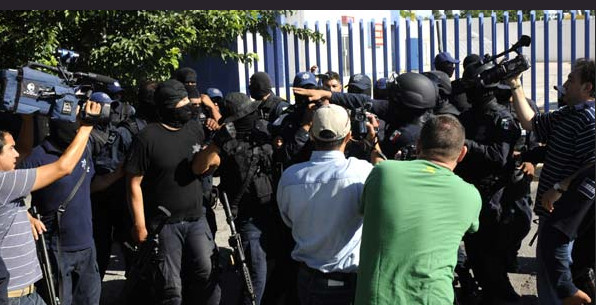 At least 300 armed and hooded Federal Police officers blocked Av. Lopez Mateos and surrounded their temporary headquarters at Hotel Playa, leading to six injuries after one hundred officers were called to break up the demonstration.