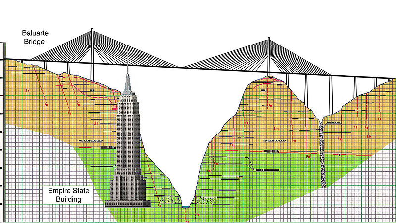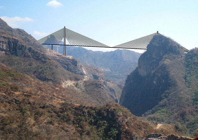 When it is completed in 2012, the Baluarte River Bridge will not only be the highest bridge in North America but the highest cable stayed bridge in the world surpassing the Millau Viaduct in France. It is the crown jewel of the greatest bridge and tunnel highway project ever undertaken in North America. Known as the Durango-Mazatlán highway, it will be the only crossing for more than 500 miles (800 km) between the pacific coast and the interior of Mexico. The path of this new highway roughly parallels the famous “Devil’s Backbone”, a narrow road that earned its nickname from the way it follows the precarious ridge crest of the jagged peaks of the Sierra Madre Occidental mountains. The dangerous road is a seemingly endless onslaught of twisting, terrifying turns that are so tight there are times the road nearly spirals back into itself.