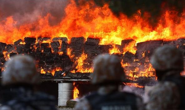 TIJUANA, Mexico — Tons of marijuana — 134 tons, in fact — sat on a makeshift platform Wednesday on a military base here. And then, after a military band, after speeches by Army and police commanders, after a laborer sprayed fuel on the verdant, pungent bales, after college students and dignitaries and a throng of journalists took aim with their cameras, it was lit on fire.