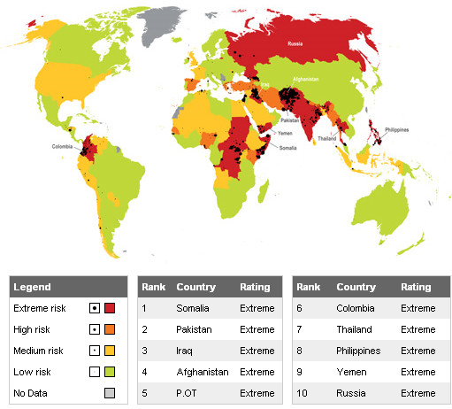 That, in some ways, in the point, Bennie. Whatever “terrorism” is, it’s nothing that really affects Mexico. Gangsters are not politically motivated (beyond wanting a state that doesn’t interfere with their business… in that being no different than any other trade group). You’d probably have to plow through Maplecroft’s data (which they probably charge for) to find their parameters for coming up with the data they did, but the countries shown as “high risk” are all those with serious political and social struggles.