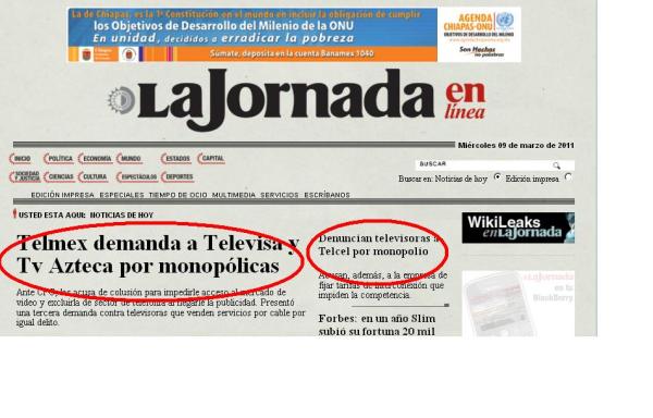 More on this later today (or tomorrow), but lookie here… TelMex calls the two TV networks (really, one and a half networks, having pretty much an overlapping ownership) of being a monopoly … and the television guys say “it takes one to know one”. As the various cartels fight it out for cable access and internet carrier rights, it’s gonna get downright ugly. And probably a lot of fun to watch.