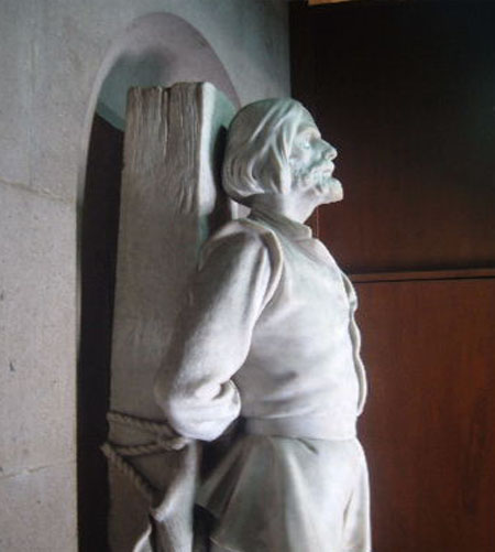 After an attempted jailbreak (dungeon-break) in 1651, he was locked in solitary confinement, and reported to have gone completely mad. Unable to break him (or perhaps he really had gone around the bend), he was sentenced to be burned at the stake in 1659, but — even mad or not, he was not going to give in, nor to give the colonial ruling class the satisfaction of controlling his fate. He spoiled a perfectly good heretic burning, when he hanged himself from the pyre.