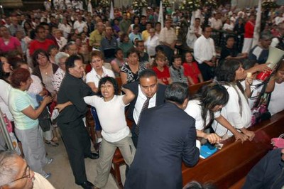 The Cardinal’s mouthpiece Msgr. Hugo Valdemar was blathering on about the insult to the Virgin — a Virgin of Guadalupe statue being broken during the scuffle. Of course, the PRD denies having anything to do with all this, protests against “idolatry” and demands to read “the Blue Book of the Prophets” not usually being on the PRD agenda. And, it looks as though the iconoclast in all this was Martinez, who was wielding the Virgin statue as a cudgel against the protesters. At least he was gentlemanly enough to only bop the guy, and not the women (one of whom was faking a pregnancy).