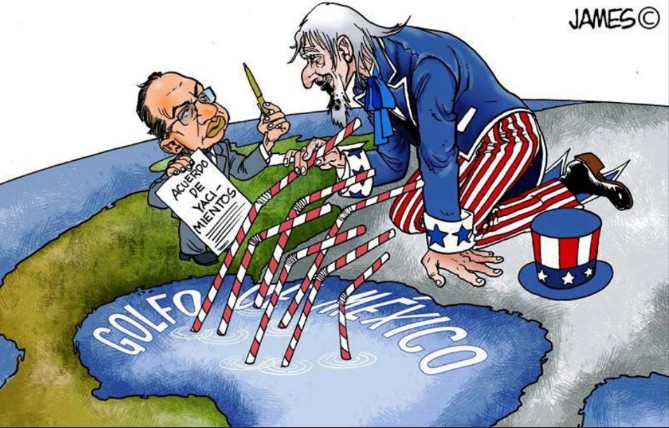 While I am dubious of the proposition that U.S. privately owned oil companies are the only (or the best) partners for PEMEX … or even if PEMEX necessarily needs foreign partners… or even if it is necessary for Mexico to sell oil to the United States (the existing reserves would more than meet domestic needs here, and allow for expanded manufacturing, although it would require a major overhaul of the existing tax system), there are good arguments to be made for resolving the questions of which country has the right to exploit these oil reserves in that “area of high interest”. And, being a country with a lot of oil and a crappy army, there’s every reason to avoid things that could “lead to disputes” with a country that has invaded here three times, and has occupied other oil rich nations under the rubric of “fighting terrorists”. Especially when the speaker, Mrs. Clinton, has used the term (“terrorist”) to describe those entrepreneurs who supply yet other commodities the United States uses in an appallingly larger percentage than the rest of the planet.