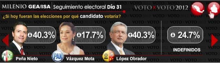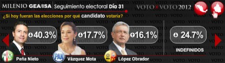 Milenio’s daily poll is not usually THIS far off (they counted 123 percent of likely voters?), but I don’t take it as gospel. While all polls tend to show Peña Nieto as having a commanding lead, nearly none of them report undecided voters, nor are the demographic breakdowns (by income, or other indicator) generally reported.