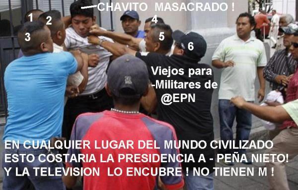 Via Guerilla Communicacional México comes this photo of an attack on an anti-Peña Nieto protester. What the Guerillas picked up is that the attackers all have military haircuts… and one is in a police uniform. Admittedly, a corte militar could just be a fad among Peña Nieto supporters, or this particular bunch of guys just happens to all favor the same barber with a limited repertoire. … but I don’t believe that either.