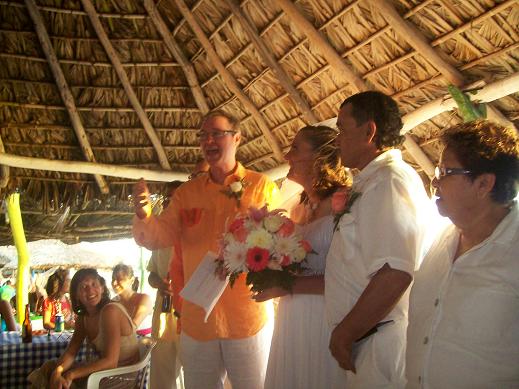 But c’mon… despite the elegance surrounding the event (the Church service being held in Mexico City’s Regina Coela, a gem of Churrigueresque ecclesiastical architecture, and the music was nice… and I guess there is some vicarious thrill in watching TV stars and their moms and dads in formal-wear… the wedding I attended yesterday — at a beach palapa, where a white beach shirt with no lettering or picture on it is what passed for overly formal-ware and the hoc service (the judge had a last minute meeting out of town, and the legal marriage had been performed earlier in the day) did not feature a symphony orchestra and wired for sound priest, but was shouted over the banda group entertaining in the next palapa, had a little more class. Or at least I can relate to a wedding where at least I know the bride and groom, in person.