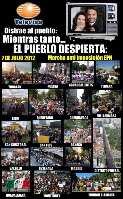 On the other hand, given that Televisa is under increasing scrutiny for NOT broadcasting any real news… like the mounting protests against the network”s role in the recent presidential election, and the street protests against both the network and what is seen as the imposition of the candidate they backed and who received the most votes in what is seen as a tainted election, there is also the sense that the network is desperate to avoid anything even slightly controversial. It’s not much discussed outside Mexico (or even in Mexico), but one reason Televisa would much prefer a PRI presidency is that both PAN and the Citizens’ Movement coalition (PRD-PT-MC) were pushing to break Televisa’s stranglehold on television broadcasting. With a PRI majority in congress, bills to create a third network and open up channels for local and alternative broadcasters might be pushed back, or overridden.