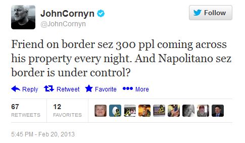 Let’s see… 300 per day = 9000 per month = 108,000 per year. Senator Cornyn claims this is somewhere in “South Texas” but doesn’t seem to have a clue where along th 1,241 miles of border the U.S. Border Patrol defines as “South Texas” there is this supposed influx.