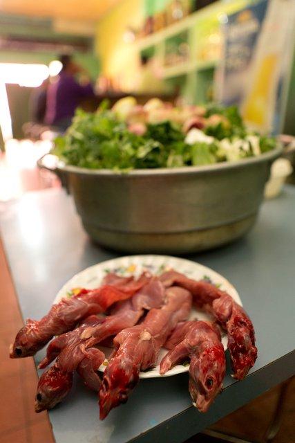 The rats themselves are not street rats, but “Ratas del campo”… packrats (specifically, the White-Throated Woodrat, Neotoma albigula) which itself has a pretty healthy diet of nopales. While there is some danger that packrats are being over-hunted (usually by boys with slingshots) for the twenty or so pesos each rat brings in the market, which could change if foodies catch on to this latest trend in low fat dining.