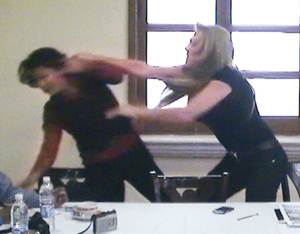 Following Guillermo Godínez’s arrest for the attack, and based on evidence that other establishment political figures were involved, Marroquín called a press conference to discuss the issue.  Isabel Godínez crashed the conference, and… well… shall we just say, it was one of those situations not covered in Roberts’ Rules of Order?