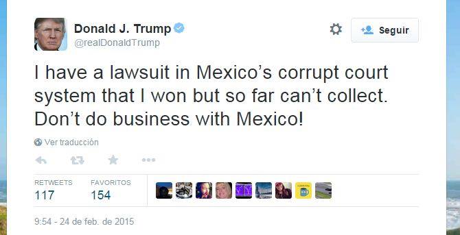 The only Mexican lawsuit I can find that Trump “won” was against his partners in the never completed Trump Ocean Resort Baja … a planned condominium development in Punta Bandara, Tijuana… in which (mostly US) investors claimed they lost 32 million dollars and Trump (who further claimed he was only a “spokesman” for the development… even though he and his daughter both made public claims that they were the developers), claiming he lost 40 million dollars, also sued the developer. The developer, for their part, went into bankruptcy.