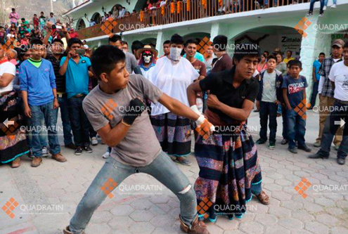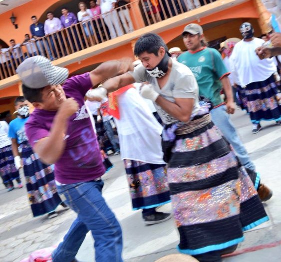 From three in the afternoon until seven at night… the townies and the bumpkins battle each other outside City Hall… some, in honor of their ancestors, in full pre-Colombian battle dress (minus the weapons), others in full or half drag in honor of their brave ancestral women, and others… however they want. The fights are refereed by “Capitáns” chosen from both communities. Last year, for the first time in modern history, somebody was killed, so… tradition must be respected… this year, the local army unit, the police, and the rural autodefensa (the neighborhood watch/milita that guards the rural population from the depredations of narcos and other organized crime figures) stood by, keeping a watchful eye for anyone who took things too seriously, or was became too enthused after the regular between-rounds mezcal breaks.