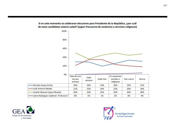 Not what I would expect. AMLO does well, very well, among the most devout (measured by the frequency of church attendance) although Anaya does better among Evangelical Protestants than AMLO, even though AMLO’s coalition includes the openly Evangelical “Social Encounter” Party. And… very surprising to me… Anaya actually gets a better percentage of the vote among the unchurched, although given AMLO’s quasi-biblical language at times (and his first presidential run, which took its name (“For the good of all, but first the poor”) directly from Liberation Theology. Perhaps Anaya comes across as “goody-goody” whereas AMLO comes across as Godly?