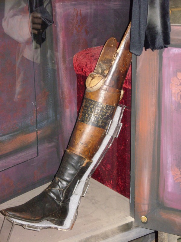 Or, as appears to be the case with the Illinois leg (in the photo), it was simply strapped to Santa Anna’s stump, and likely come loose and make him lose his balance.  The socket itself held the artificial leg in place, but … with fittings being hit or miss… it would have put additional pressure on the stump (which, with the battlefield amputation, never healed correctly, leaving a piece of bone exposed.
