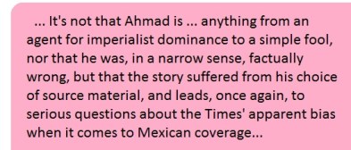 So, it’s not that Ahmad is … as some have it in the “cybersphere” over the last day… anything from an agent for imperialist dominance to a simple fool, nor that he was, in a narrow sense, factually wrong, but that the story suffered from his choice of source material, and leads, once again, to serious questions about the Times‘ apparent bias when it comes to Mexican coverage (especially coverage of the 4th Transformation).