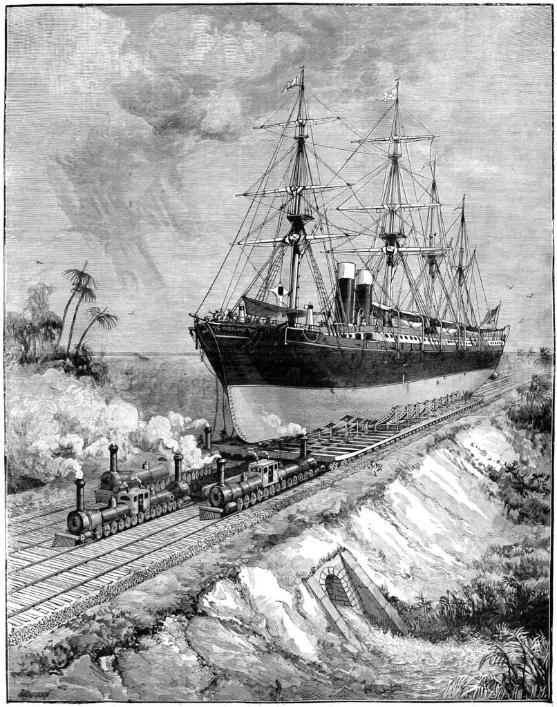 James Eads, the civil engineer who’d “miraculously” figured out how to build a bridge across the Mississippi, was surely the man to “reverse engineer” bringing ships across land, rather than land traffic across water. And, as a government contractor, he had the ear of both Washington and Wall Street. His plan was somewhat sci-fi… or rather, this being the 19th century, steam-punk. Eads envisined dry-docks on both oceans, capable of floating a ship onto a giant flatcar, and hauled the mere 200 Km from coast to coast. This would have required building giant flat-cars spanning five tracks, pulled by a team of steam-engines… to say nothing of the dry-docks and other facilities.