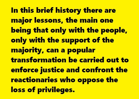 In this brief history there are major lessons, the main one being that only with the people, only with the support of the majority, can a popular transformation be carried out to enforce justice and confront the reactionaries who oppose the loss of privileges.
