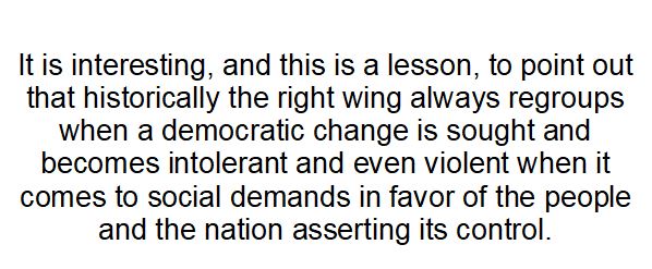 It is interesting, and this is a lesson, to point out that historically the right wing always regroups when a democratic change is sought and becomes intolerant and even violent when it comes to social demands in favor of the people and the nation asserting its control.
