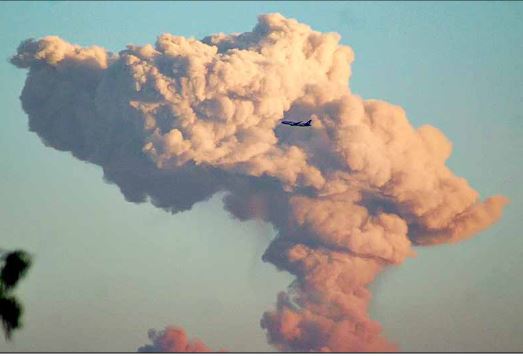 Popocatépetl spit up an enormous column of gas and ash yesterday at 6:25 p.m. Yes, that little dark spot is an airplane coming in. Jornada photo by Javier Salinas.