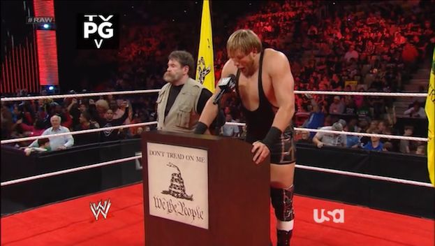 Swagger’s faux-manager, not so accidentally named Zebadiah Colter, sported a bushy hunter’s beard and wore a beige vest as he yelled to the crowd: “What’s wrong with America?” Colter then explained that he “doesn’t recognize” today’s America. He said he saw people with faces “not like mine” and heard people that “can’t even talk to me,” and he screamed out again to the Nashville audience and the Americans at home: “Where did all these people come from?” And then Colter, who’s used other surnames to fit his gimmick in the past, threw out some catchphrases familiar to any Tea Party observer — “We, the people” was prominent — and made a point to stress, over and over, that he and Swagger were “real Americans.” Oh, did the crowd ever boo.