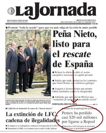 While there’s a delicious irony in president-in-waiting (“president-elect” would require making some assumptions that aren’t universally accepted in Mexico) Enrique Peña Nieto is offering to “rescue” Spain from its recent economic turmoil, while at the same time, he’s looking to open PEMEX to Spanish investors… after PEMEX just lost a bundle on Spanish oil company investments.
