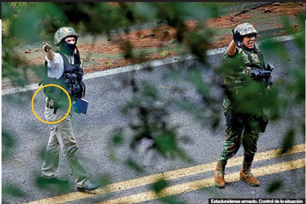 And… while we’re at it. I can’t vouch for this photo, said to have been taken at the scene, but who is the guy in civilian clothing wearing a mask and a Mexican marine helmet, and carrying a pistol?