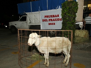 Sunday’s Expo-Fraude on the Zocalo in Mexico City garnered a reported 25 TONS of evidence that was presented to the electoral authorities yesterday. Among the evidence turned over was one pig, two turkeys, several chickens and a sheep— allegedly given to rural residents in return for their votes for the PRI. It is not illegal for elected officials to “gift” constituents with goods and or services (or even livestock) paid out of municipal funds, but what started as a well-intentioned public service has often been abused by political parties and candidates.