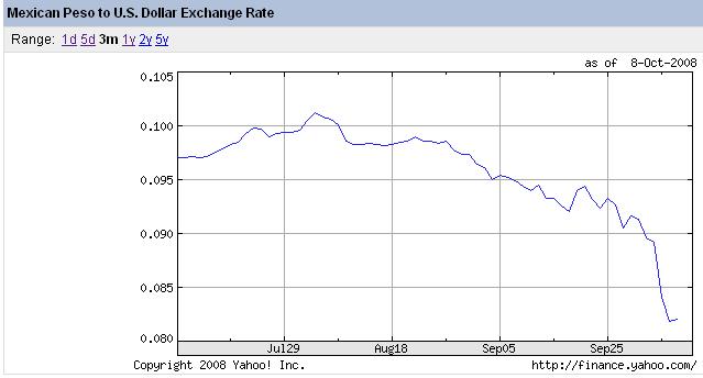 OUCH! It’s counter-intuitive that the Peso keeps dropping … Mexican banks are in no trouble, the only housing crisis is that there aren’t enough being built fast enough to meet demand, and the Banco de Mexico is unloading dollars by the billions from its huge foreign reserves there is the assumption that the peso SHOULD fall when the U.S. economy goes in a tailspin.