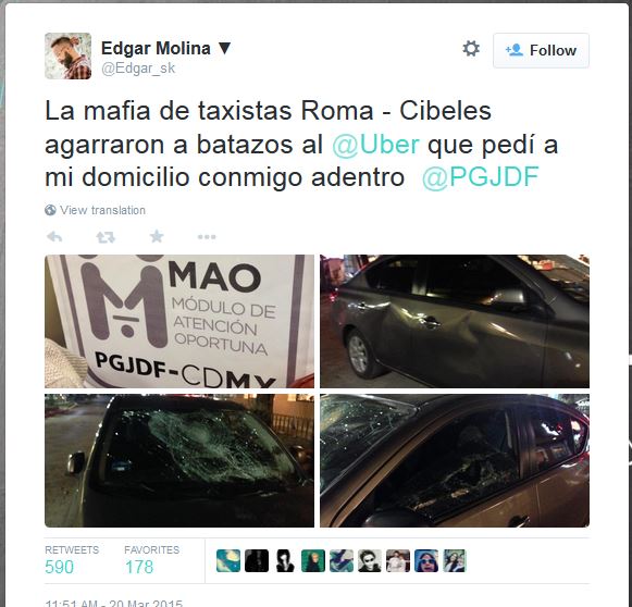 Uber asegura que taxistas vandalizaron uno de sus vehículos en el DF (CNNMéxico, 21 Marzo 2015)