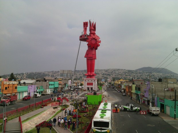 Looming above Chimalhuacán, Estado de México is the new 60 meter, 870 ton “Guerrero Chimalli”. Inaugurated 13 December, the Mexican sculptor Sebastían and the local administration who commissioned the 30 million peso project say the work commemorates the municipality’s progress, the warrior’s shield symbolizing the community’s protection against poverty and want.